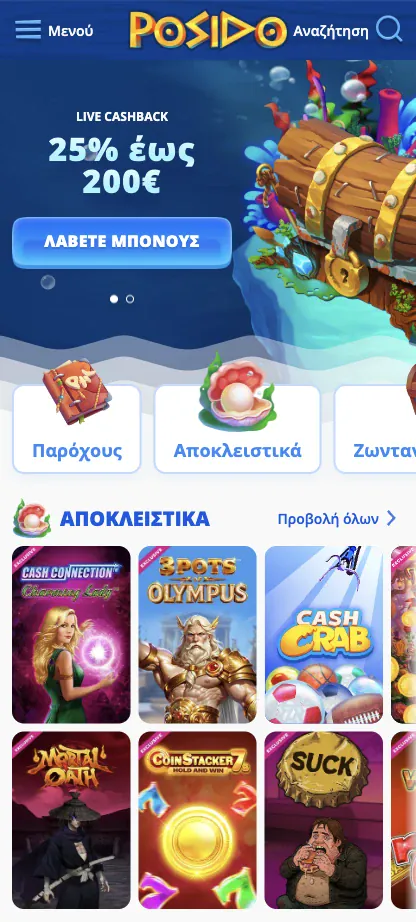 Όταν παίζεις έτσι, εξακολουθείς να έχεις τις ίδιες ενότητες lobby όπως στο desktop. Αυτό περιλαμβάνει live casino, blackjack, ρουλέτα, baccarat, παιχνίδια crash και ξυστά, καθώς και αθλητικό στοίχημα και eSports. Αν σε ενδιαφέρουν κυρίως τα reels, η επιλογή μας κουλοχέρηδες καζίνο Posido περιλαμβάνει κλασικούς, video και τίτλους με πολλές λειτουργίες από τους αναφερόμενους παρόχους μας. Για γρήγορο έλεγχο προσφορών, μπορείς να ανοίξεις τις Προωθήσεις από το mobile μενού και να δεις τρέχοντα reloads, cashback και τουρνουά.